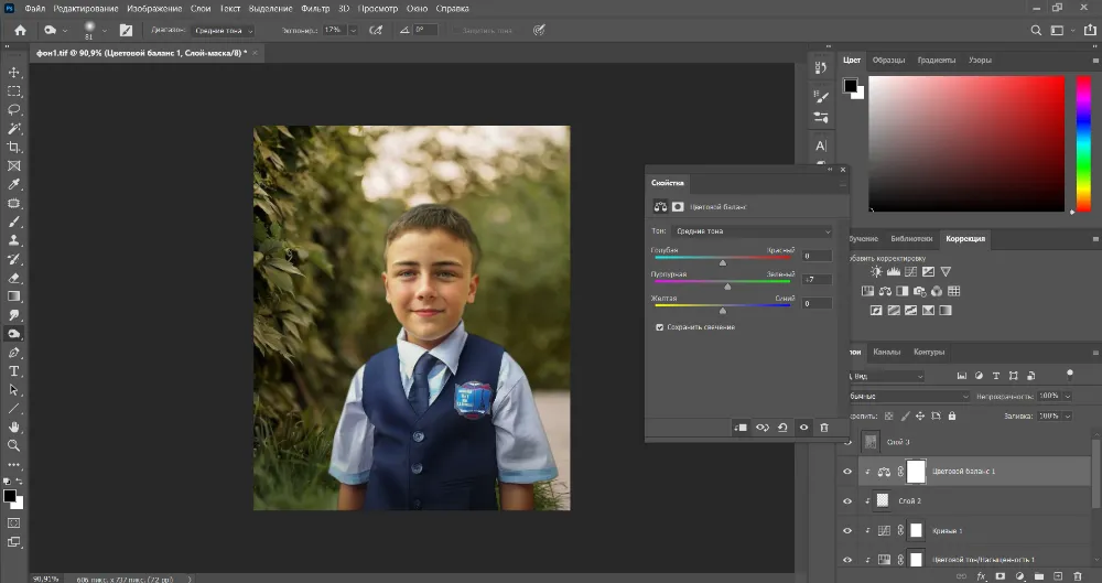 Теперь подмешаем во вписываемый объект немного зеленых оттенков, чтобы подогнать его под фон еще больше. Используйте «Цветовой баланс» в режиме обтравочной маски. В «средних тонах» сдвиньте средний же ползунок в сторону зеленого до +5 или +7.