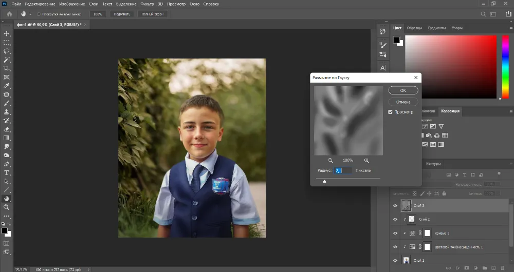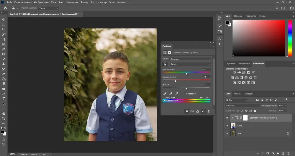 Также нужно немного снизить насыщенность синего, чтобы и жилетка не выбивалась. Вызовите опцию «Цветовой тон/насыщенность», включите режим обтравочной маски, выберите синий канал и подвиньте ползунок на шкале «Насыщенность» влево, ориентируясь на общий план.