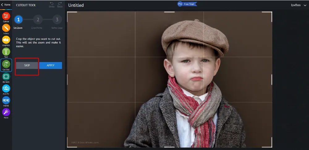 Далее программа предложит выполнить обрезку, чтобы зумировать вырезаемую область. Откажитесь от этого, нажав «Skip».