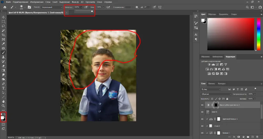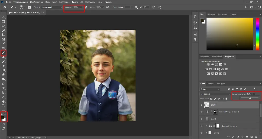 Создайте пустой слой и кистью черного цвета с низкой непрозрачностью пройдитесь по низу и краям снимка. Смысл двух последних пунктов заключается в том, чтобы добавить картинке еще большего объема и выделить лицо мальчика.