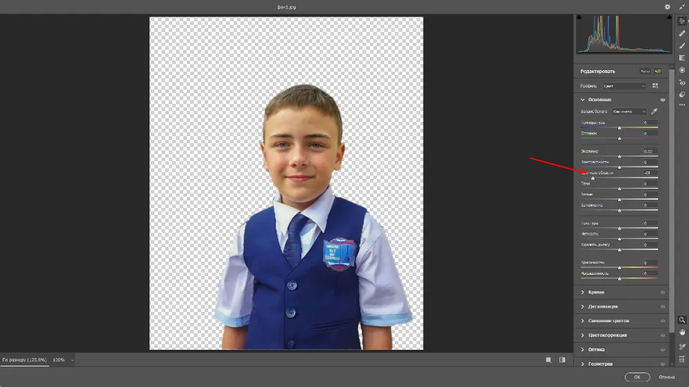Приглушите белые рукава рубашки, которые смотрятся слишком ярко. Для этого откройте «Камера RAW» (раздел «Фильтр»), и ползунок на шкале «Светлые области» переместите влево. Нажмите «Ок». Теперь объективно стало лучше: белые области как будто уплотнились и в них проступили детали.
