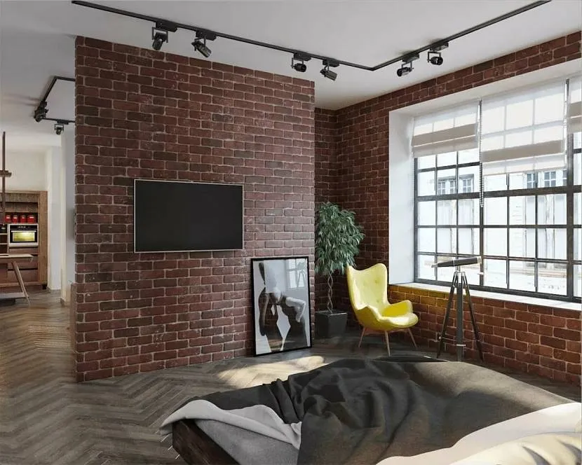 Крашенная кирпичная стенка од старину в интерьере гостиной комнатыИсточник dulux.ru