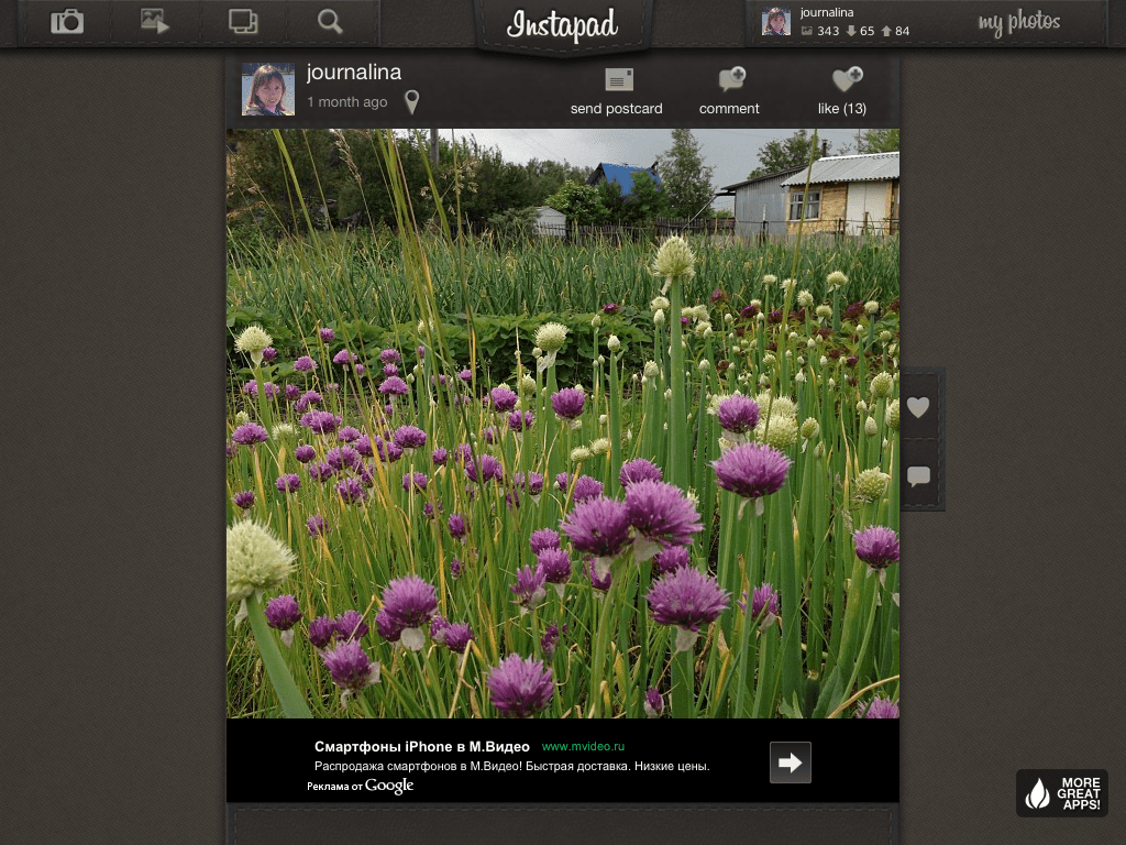 Эта программа для тех, кто не понимает, как можно смотреть фотографии на относительно небольшом экране смартфона. В Instapad изображения гораздо больше, как если бы вы смотрели их в вебе. Можно сортировать записи — видеть только свое, только друзей, только тех, кто добавил в друзья вас или кого добавили вы.