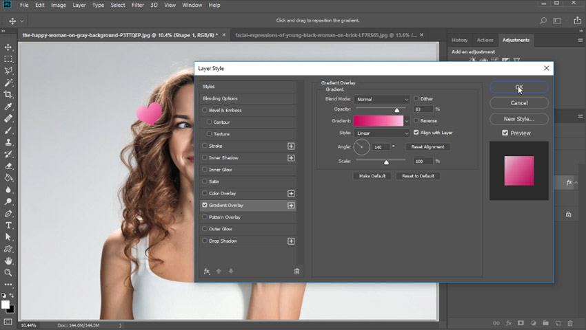 (Наложение градиента), в настройках кликаем по градиентной полосе и настраиваем цвета: #c7065c — #f56ca6 — #f5ccdd.