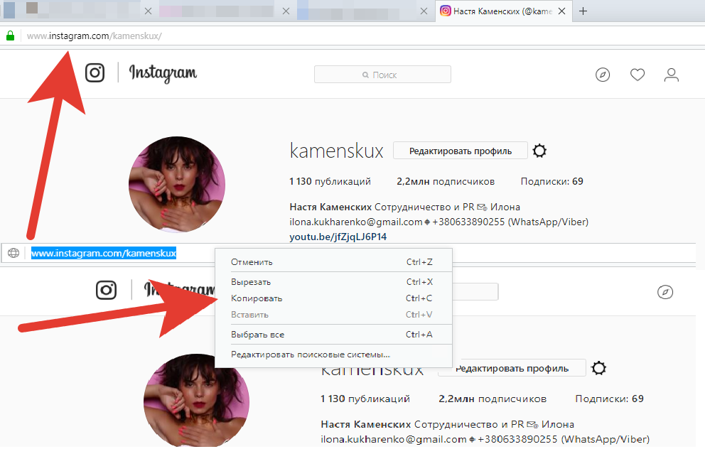 Подобная операция займет у вас не больше трех секунд. Просто зайдите в Instagram с помощью компьютера и перейдите в свой профиль. В строке сверху выделите URL-адрес, затем кликните по нему правой кнопкой мыши и выберите в контекстном меню пункт «Копировать». Дальше просто заходите в диалог с другом и нажимаете Ctrl+V, после чего в текстовое поле вставится ссылка на ваш профиль.