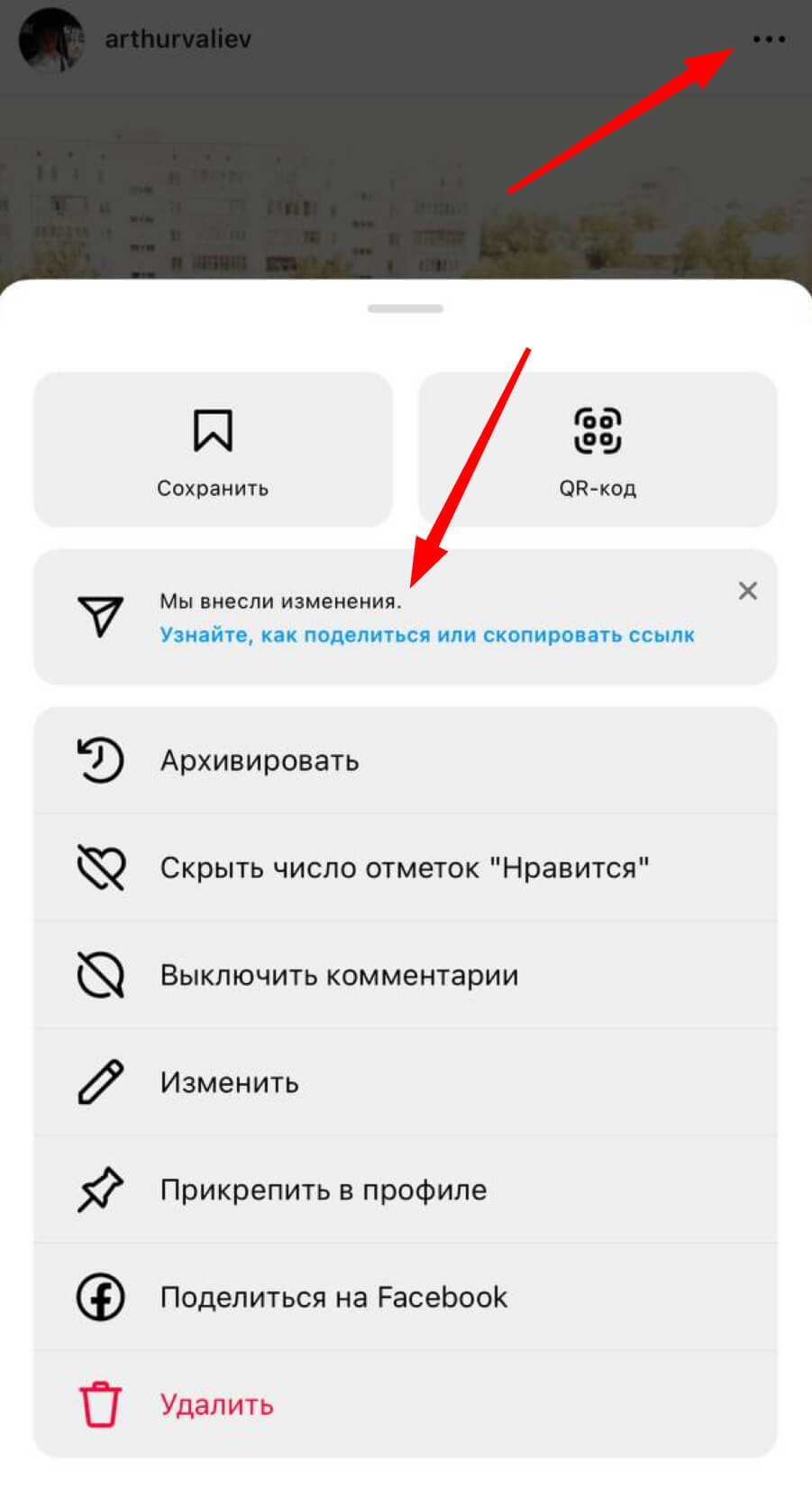 - Перейти к нужной публикации – нажать по трем точкам сверху.