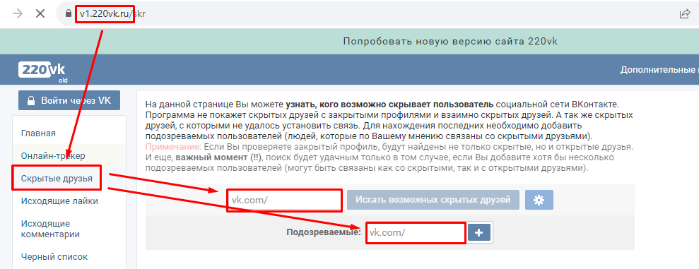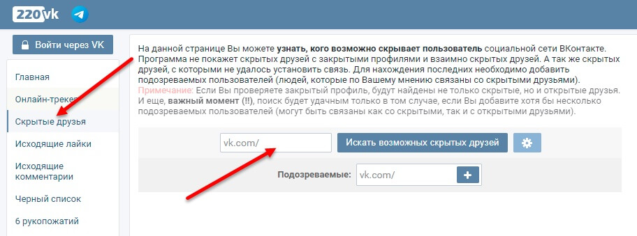В сети есть программы и сервисы, которые теоретически могут показать скрытых друзей. Один из таких сервисов – программа 220VK. На скриншоте я показала, как им пользоваться.