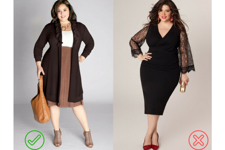 Одежда, подчёркивающая талию, помогает сформировать силуэт «песочные часы». Поэтому выбирайте модели блузок и платьев с узкой талией. В то же время абсолютно противопоказаны платья с завышенной линией талии — они делают акцент на массивном верхе.