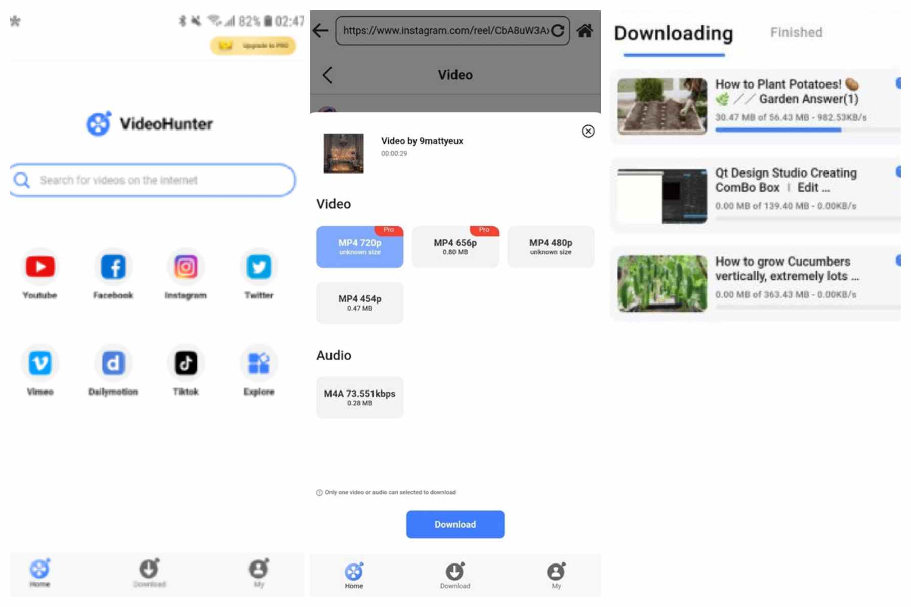 - Лучшее приложение для загрузки видео из Instagram для Android — VideoHunter для Android на 100% бесплатен. Он может загружать неограниченное количество видео и аудио из Instagram на Android в форматах MP4 и MP3 на высокой скорости.