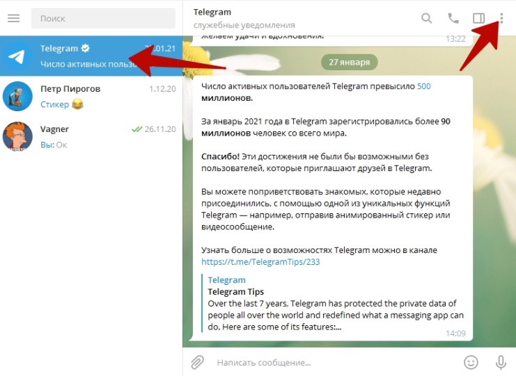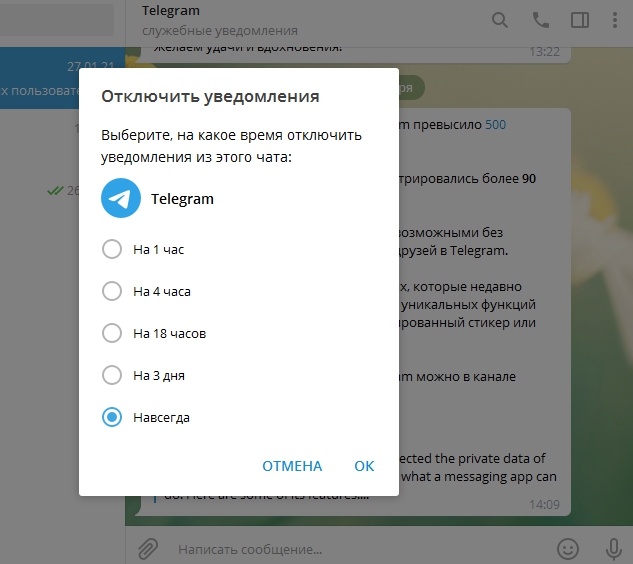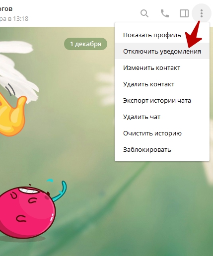 Рассмотрим вариант, когда требуется отключить уведомления Телеграм или звук только у сообщений от конкретного пользователя или канала.