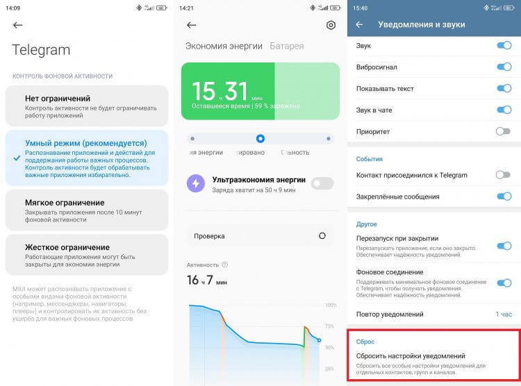 Если ничего из вышесказанного не поможет, сбросьте настройки уведомлений в Телеграм. Все вернется к стандартным параметрам, и вам придется заново добавлять исключения. Однако именно этот способ чаще всего позволяет включить уведомления в Telegram, если постоянно менялись настройки.