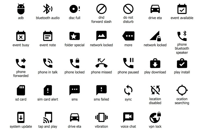 Интерфейс смартфона состоит из символов разного цвета, формы, размера и назначения. Это значки приложений в меню и на главном экране, иконки в «выезжающей» сверху вкладке-шторке, маленькие значки уведомлений со строки в верхней части дисплея мобильника.