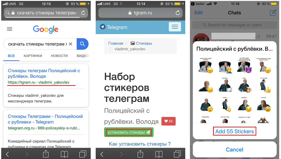 Если есть какие-либо наклейки в одном из чатов, групп или каналов, которые нужно добавить в свой список, то на ОС Андроид и iOS устройствах это делается практически одинаково. На iPhone и iPad устройствах нажмите и удерживайте палец на наклейке, которую хотите добавить, а затем нажмите «Добавить» в открывшемся меню, и затем подтвердить действие. А на Android устройствах просто нужно нажать на желаемый стикер.