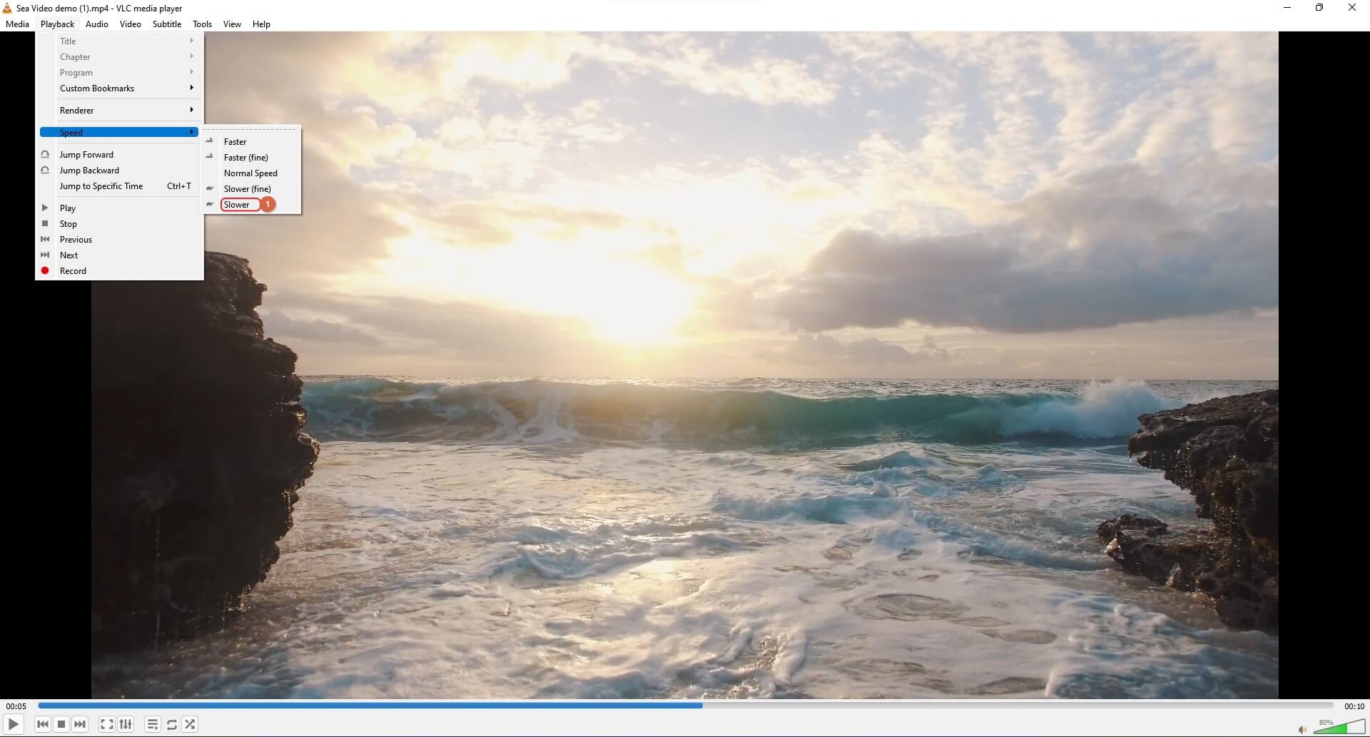 Когда начнется воспроизведение, нажмите кнопку Пробел на клавиатуре, чтобы приостановить видео. Далее перейдите в Воспроизведение меню сверху, перейдите к Скоростьи нажмите Медленнее (хорошо) однажды. Это уменьшит скорость до 0.90x. Щелчок Медленнее (хорошо) снова замедлит видео до скорости 0.80x. Вы можете повторять этот процесс, пока не уменьшите скорость до желаемого уровня. Нажимать Пробел еще раз, чтобы возобновить воспроизведение в замедленном режиме.