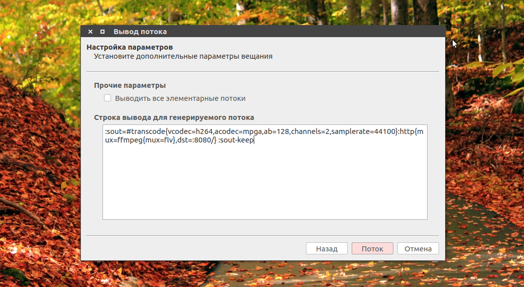 В следующем окне вы можете настроить различные параметры ffmpeg для потока если это нужно, затем осталось нажать кнопку Поток