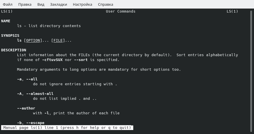 Команда man (сокр. от «manual») — отображает справочные страницы, которые являются руководством пользователя, встроенным по умолчанию во многие дистрибутивы Linux и большинство систем Unix. Например, команда отобразит руководство пользователя, а команда отобразит справку по команде .