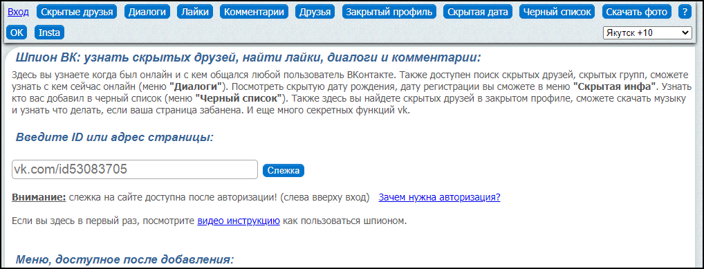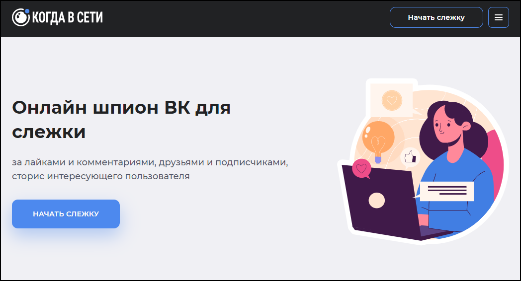 Первым в топе находится «Когдавсети». С его помощью всегда можно просмотреть, кто находится онлайн, кому пишет, ставит лайки, комментирует. Прежде, чем начать слежку, пользователю нужно зарегистрироваться на сайте.