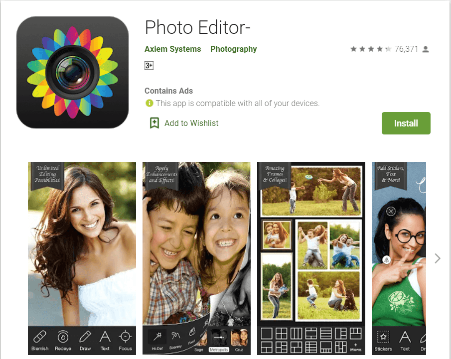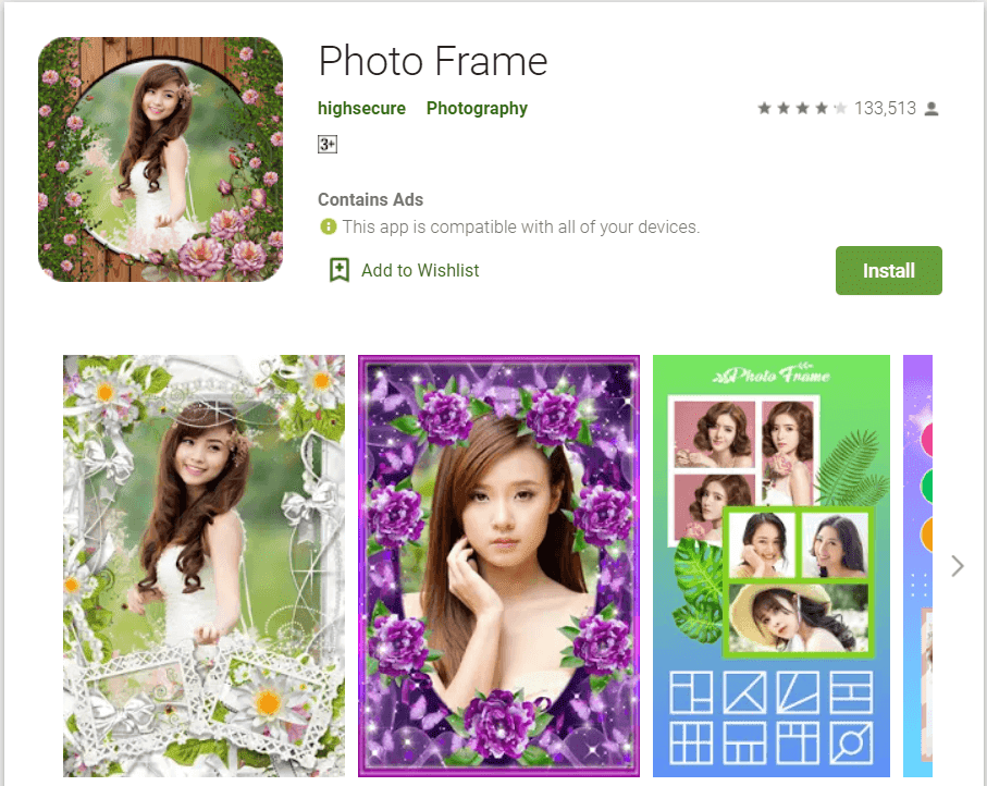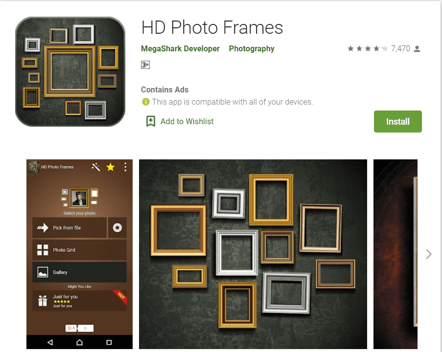 This app, ‘Photo Editor,’ developed by Axiem Systems, is one of the best editing apps that comes with a plethora of frames. You can choose over 50+ frames and optimized overlays. Besides, Photo Editor also offers paint and draw features, filters, and tons of stickers. Not only that, but it also offers various facial editing effects. You can also use the camera option of this app to take HD (High-Definition) photographs.