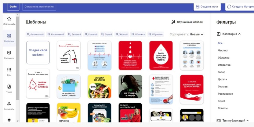 Готовые изображения, шаблоны и элементы для создания креативов можно найти среди инструментов онлайн-редакторов визуала. Например, в SMMplanner есть раздел «Холст», в котором собраны: