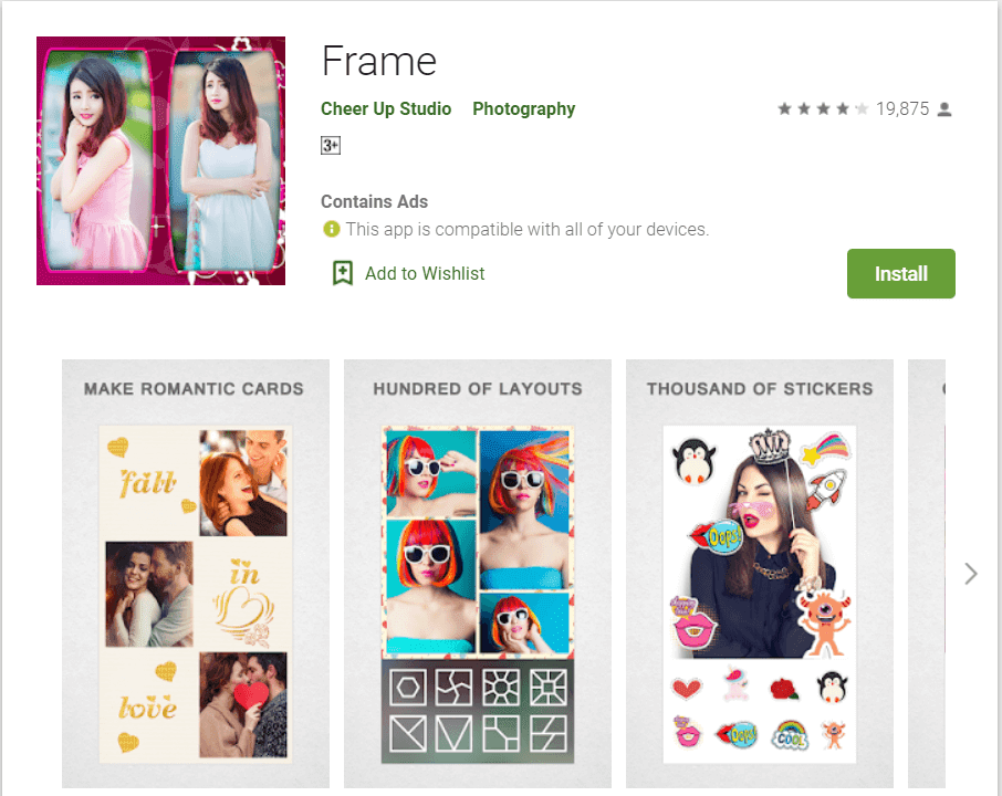 If you love photographs with artistic frames, you should try out the Frame app by Cheer Up Studio on Google Play. The Frame provides tons of elegant and artistic frames to add to your pictures. You can add amazing filters and high-resolution frames to your photos using Frame. You can choose from over 100 grid frames and numerous art frames. You can instantly share the edited photos on your Social Media. Also, the Frame app is totally free!