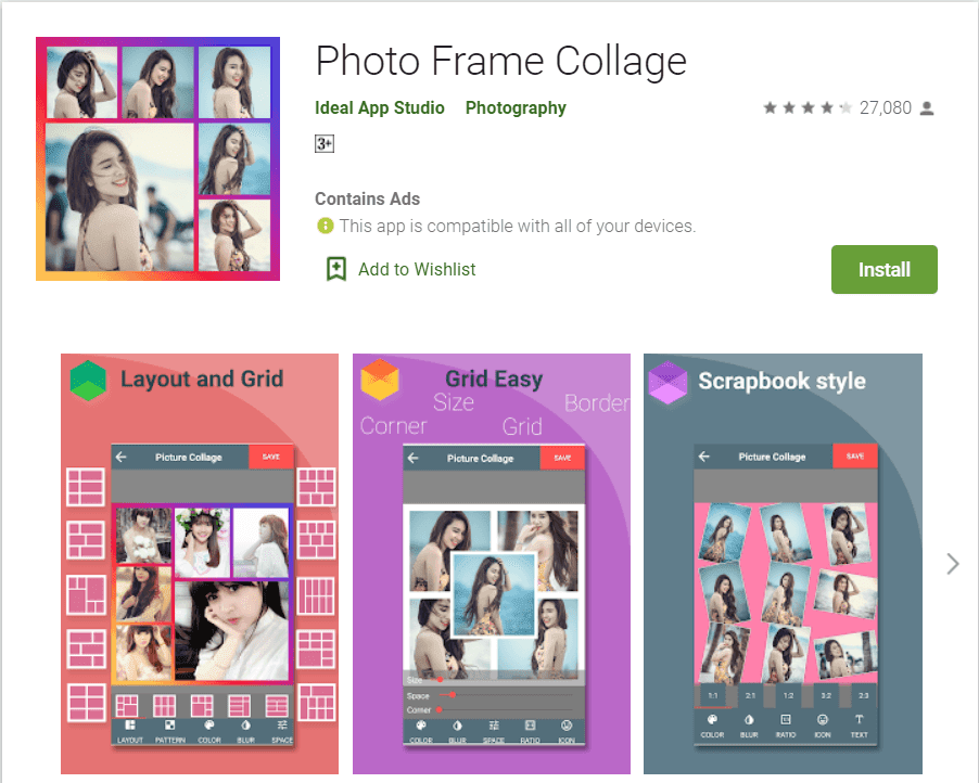 Photo Frame Collage is one of the best photo frame apps for Android that comes free of cost. You can choose over 200 frames in Photo Frame Collage. The app offers a clear user interface and easy-to-use editing tools. You can even create scrapbook-style collages in this app. Photo Frame Collage helps you create great collages and share them on your social media pages.