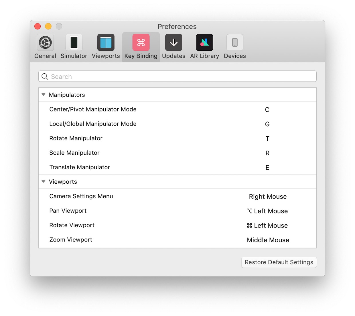 Для ввода собственных сочетаний клавиш, требуется открыть в строке меню: AR Studio > Preferences (Настройки) > Key Binding (Привязка клавиш) и создать новый ярлык. В меню возможен сброс настроек и восстановление по умолчанию.