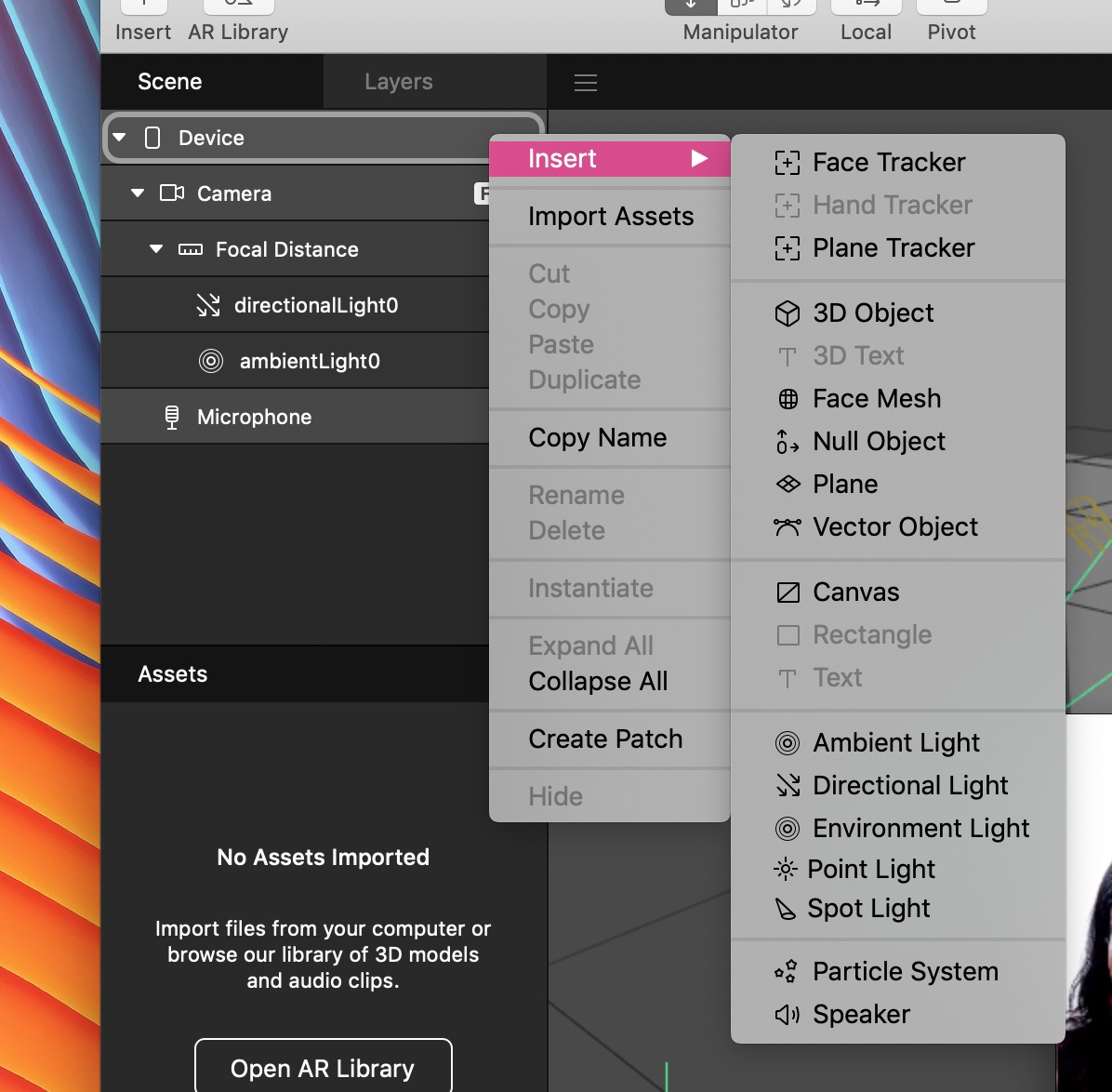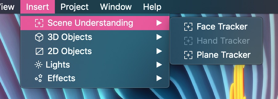 Нажмите «Insert (Добавить объект)», выберите «Plane Tracker». Вы увидите, что он указан на панели «Scene» как planeTracker0.