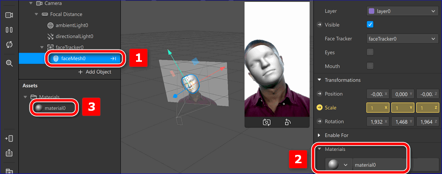 - Для создания маски добавить трекеры лица, пройдя путь: «Insert» — «Scene Understanding» — «Face Tracker». На лице, изображенном на экране, отобразятся оси. Именно в этом разделе можно визуализировать любые действия с маской. В левой части экрана будут отображаться слои, которыми можно управлять.