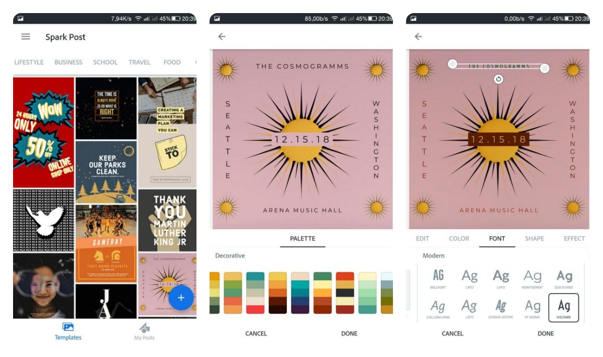 Приложение от признанного гиганта индустрии Adobe. Оно и правда сразу выделяется на фоне конкурентов. Самые привлекательные возможности: разделенные по тематикам шаблоны, выбор палитры, много кириллических шрифтов.