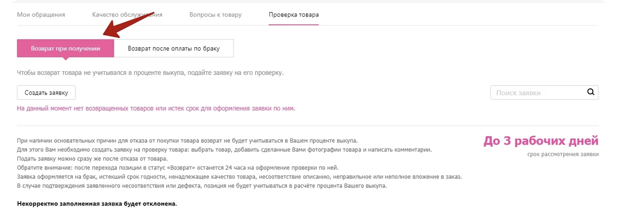 - Структурные подразделения – пункты выдачи. Это самый простой способ. При выявлении несоответствия в процессе эксплуатации необходимо подать заявку на возврат, воспользовавшись личным кабинетом пользователя. Если брак виден невооруженным глазом, претензия обрабатывается сразу, а потраченные средства возвращаются на банковский счет, использованный для оплаты.