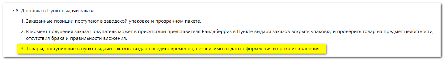 Согласно информации от представителей WB, те товары, которые приходят на ПВЗ, покупателю выдаются только вместе, т.е. как они были сформированы в магазине. Ситуация будет аналогичной, даже если были отдельные заказы, которые оплачивались по отдельности. Если обратиться к публичной оферте на официальном сайте площадки, то в п.7.8 говорится, что заказы можно получать только вместе, а время хранения товара не имеет значения. Доставленную позицию вам не отдадут, пока не прибудут остальные ваши покупки.