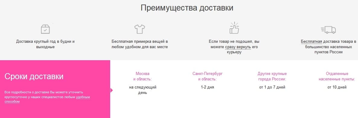 Сегодня магазин Wildberries положительно выделяется среди конкурентов своими условиями доставки. Компания открыла много пунктов выдачи в разных городах страны. Если покупатель заказывает дорогой товар или обладает высоким процентом выкупа, доставка будет бесплатной. Вносить оплату можно несколькими способами — например, пластиковой картой, электронным кошельком WebMoney или наличными средствами.