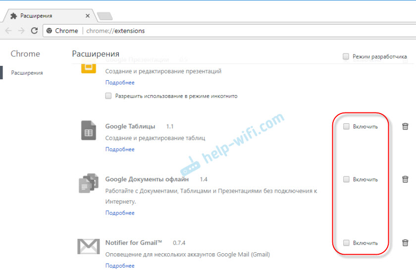 Так же временно отключите все расширения. Для этого зайдите в «Меню» – «Дополнительные инструменты» – «Расширения» и снимите галочки возле всех установленных расширений.