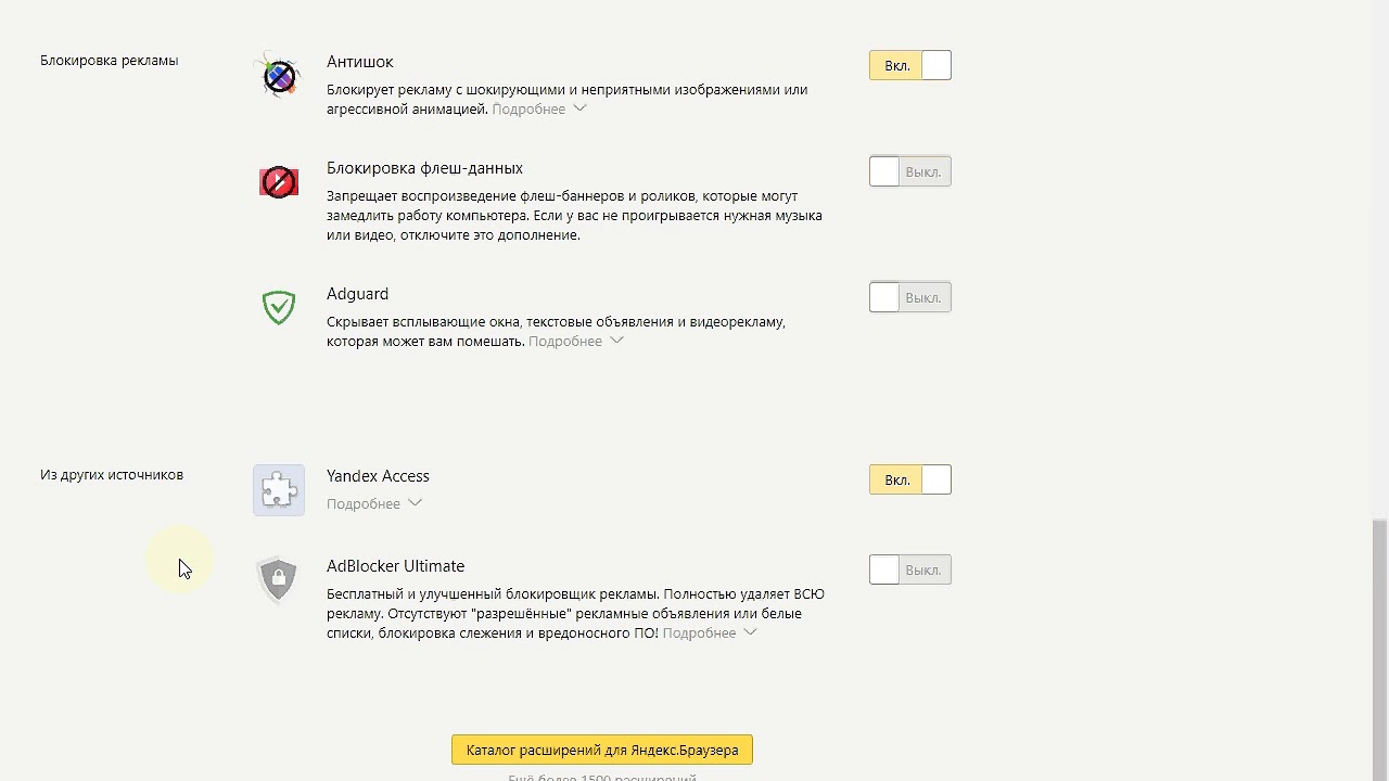 - Yandex.Браузер. Открыть «Меню», перейти в «Настройки», выбрать вкладку «Дополнения» и отключить все ненужное. Кеш очищается в настройках, на вкладке «Очистить историю загрузки».