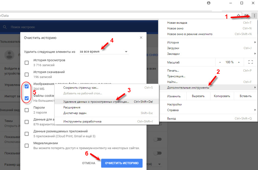 Для очистки кэша и cookie перейдите в «Меню» – «Дополнительные инструменты» – «Удаление данных о просмотренных страницах». Изображения и файлы можете спокойно удалять, а вот после очистки файлов cookie, возможно понадобится заново авторизоваться на некоторых сайтах.