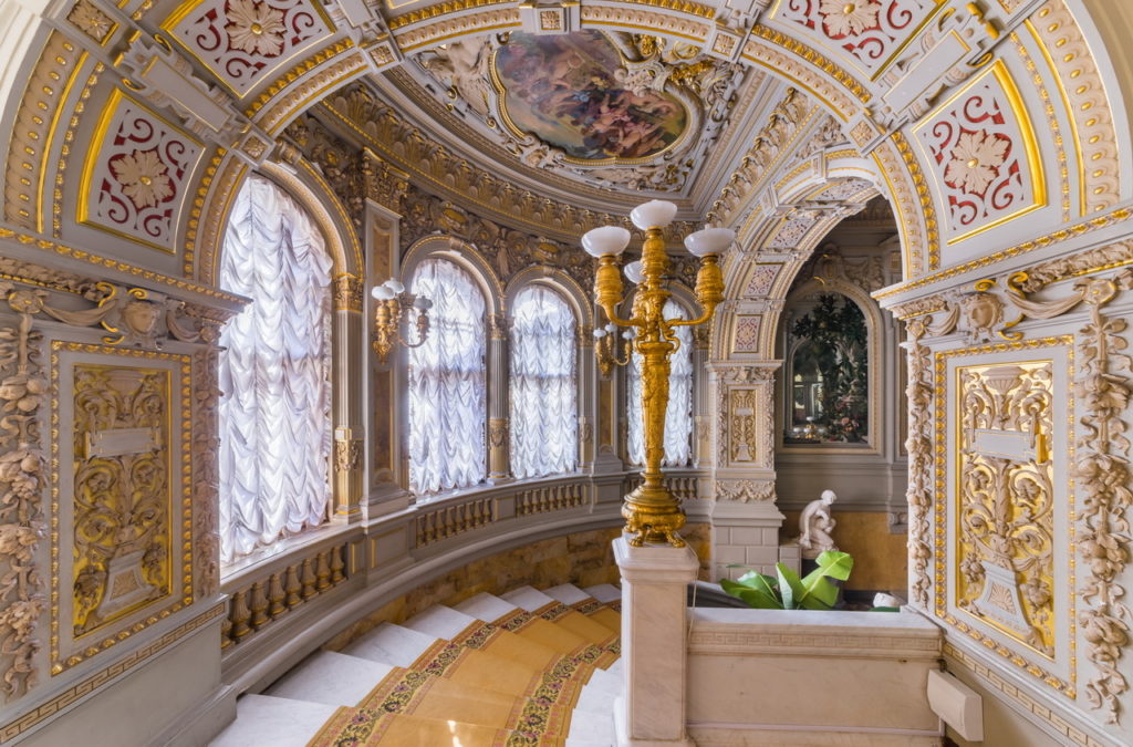 Здесь есть лепнина, резьба по камню, сложные витиеватые узоры, строгие геометрические фигуры, скульптурные композиции, трехъярусный камин, паркет ручной работы, где изображены орлы, львы. А еще в доме можно встретить элементы отделки из дорогого мрамора, уникальные световые решения. Удивительно, что при этом ощущения безвкусицы совсем не возникает. Зато увиденное захватывает дух, настраивает на романтический лад.