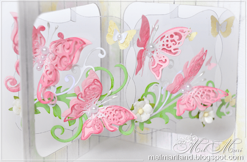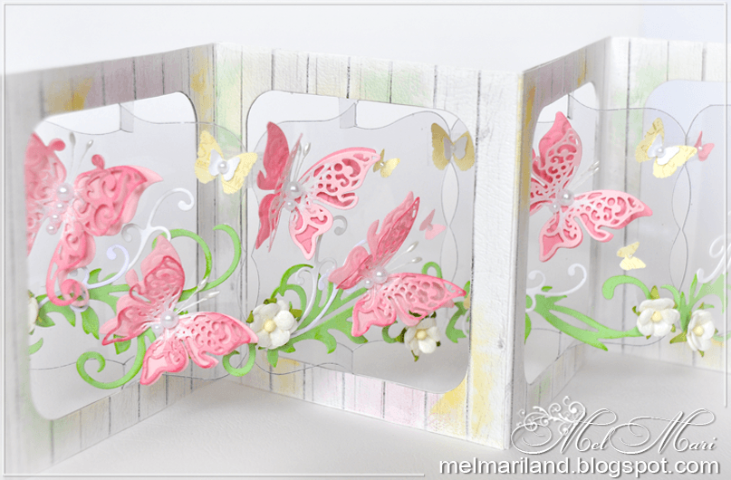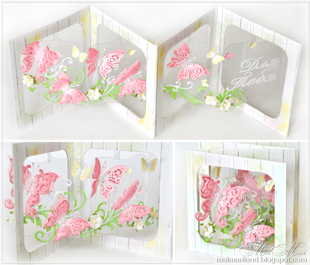 - Вырежьте бабочек, слегка расправьте им крылышки, чтобы получились объемными. Приклейте полученные декоративные элементы к картонной заготовке.