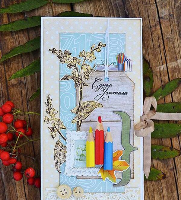 Существует направление в рукоделии, которое подразумевает создание книг, блокнотов, альбомов и открыток — скрапбукинг. Идей для творчества в этой технике огромное количество. Материалы можно приобрести в любом магазине товаров для творчества и рукоделия или в интернете. К тому же можно использовать и подручные средства, и дары природы. Очаровательные открытки в технике скрапбукинг, сделанные своими руками, порадуют любого учителя.