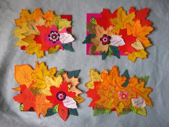 Изготовить такие открытки проще простого. Из цветной бумаги нужно вырезать листочки клена, приклеить их на основу из гофрированного картона и украсить цветочками из любой плотной ткани.