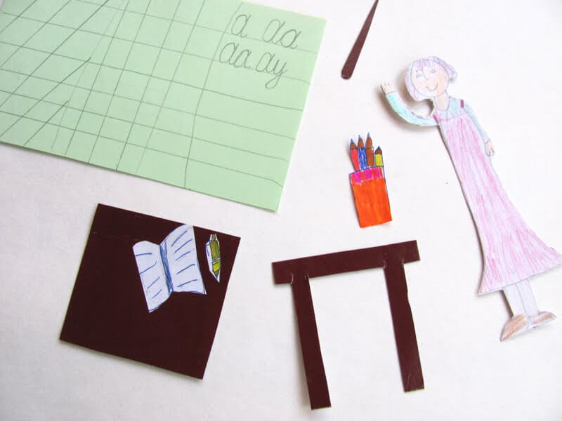 Так же Вы можете сделать тематическую открытку с объемными элементами. Ниже мы предлагаем Вам заготовку, которую можно распечатать, вырезать детали и создать необычную самодельную поздравительную открытку С Днем учителя!