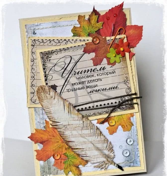 Ещё одна идея поздравительной открытки на День учителя в технике скрапбукинг. Листья можно вырезать из цветной или бархатной бумаги, фетра или ткани. Настоящая ручка может еще и послужить педагогу.