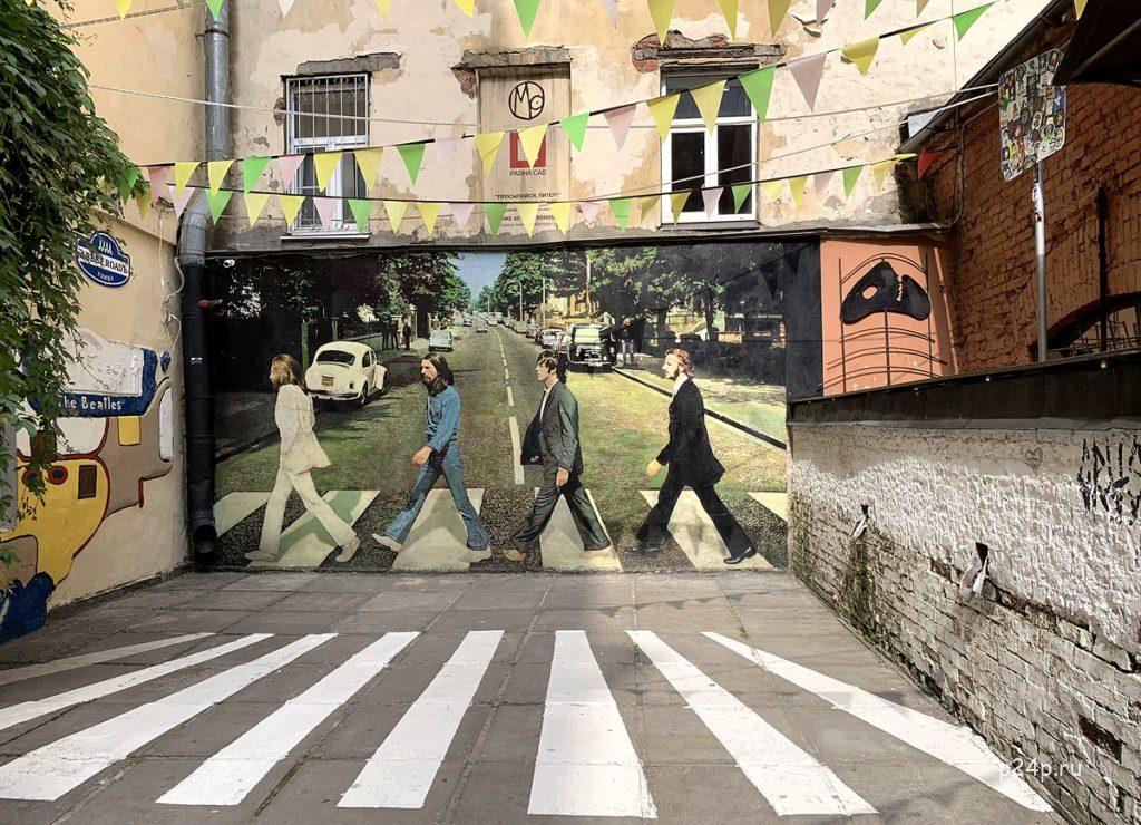 - Итальянский дворик — инициатива жителей создать кусочек Италии прямо посреди Петербурга. Стены расписаны в итальянском стиле, на них Колизей соседствует с типичными окошками. Живой плющ искусно дополняет картину.
