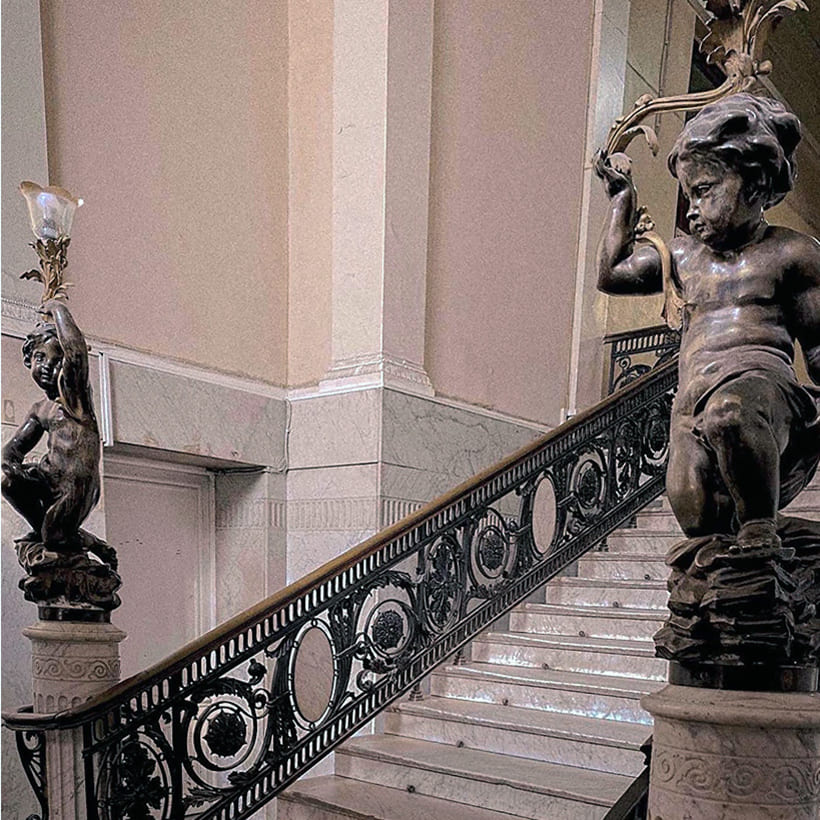В доме великолепная парадная с лестницей, достойной дворца. Она богато украшена статуями и позолоченной лепниной.