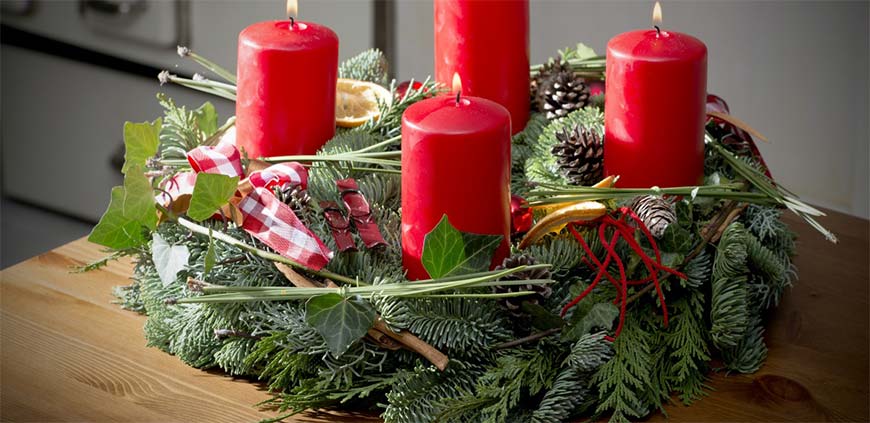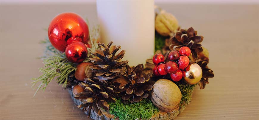 Все элементы декорации разложите на подложке и окрасьте. Проводить окрашивание следует при открытых окнах или на улице. В центр круга из картона следует приклеить свечу и заготовленные декорации. Оригинально в композиции будет смотреться веточка хвойного дерева.
