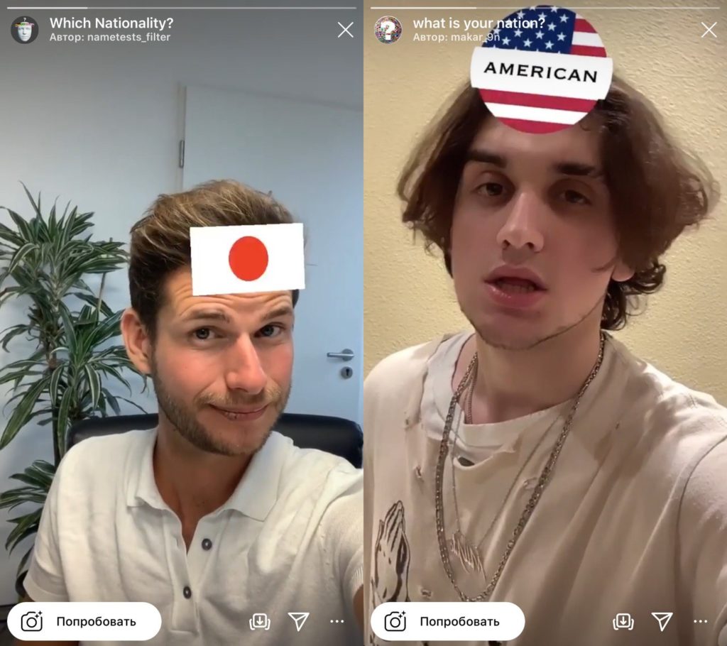 3. Еще один эффект, который вычисляет вашу национальность случайным образом ищите в аккаунте @nametests_filter, называется он Which nationality? Об этом фильтре мы вам рассказывали уже в статье «Популярные маски Кто ты из«.