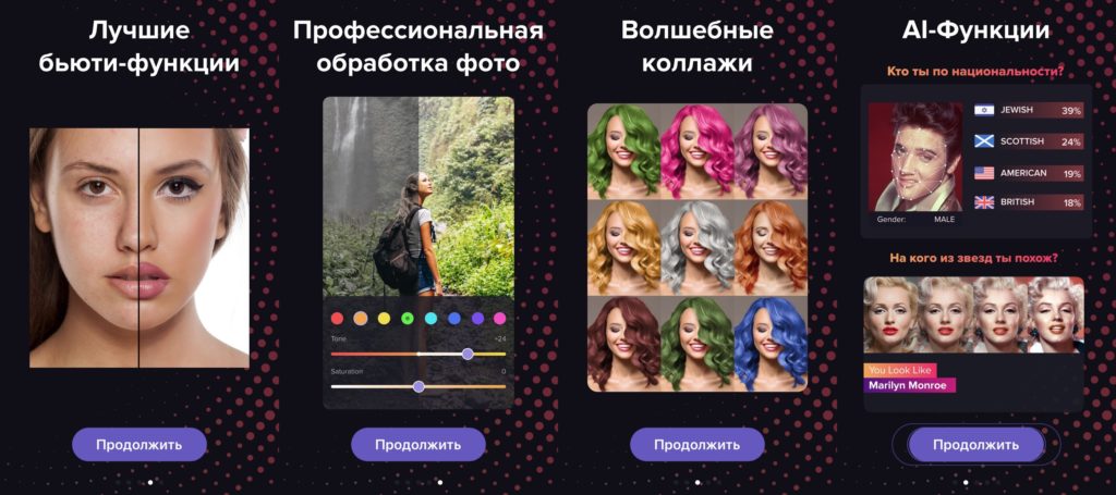 В целом можно отметить следующие функции приложения: редактирование, фотофильтры, эффекты, ретушь, изменение цвета волос, прочее. Gradient — это что-то вроде виртуального прохождения ДНК-теста. Слева ваша фотография, а справа находится список стран и процентное соотношение.