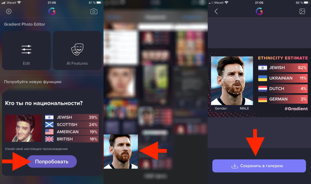 Думаю вам не слишком интересно знать, как именно искусственный интеллект обрабатывает фото и делает такие чудеса. Поэтому сразу перейдем к сути использования и могу сказать, что разработчики проделали очень большую работу над интерфейсом. Во-первых, появился русский язык, что невероятно упростило ориентирование по меню. Во-вторых, всё стало ещё проще и интуитивно понятней. Вот пример, как происходит использование фичи «кто ты по национальности»: вы запускаете Градиент; листаете описание функций и затем подтверждаете покупку при помощи Touch ID или другой системы первых три дня бесплатно, чудь дальше расскажу как отписаться ; попадаем на главный экран и нажимаем Попробовать; выбираем фотку из альбома, получаем результат; нажимаем Сохранить в галерею. Знаю, что вы скажите, зачем было писать инструкцию если и так всё понятно.