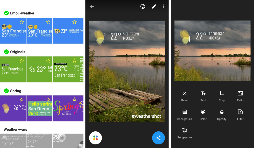 Небольшое приложение, с помощью которого можно добавлять на фото информацию о погоде, местоположении и времени.