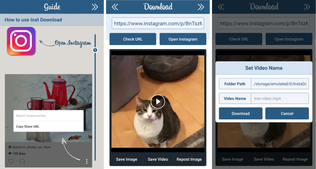 С помощью этого приложения можно скачать видео или фото из любой публикации в Instagram. Для этого нужно: