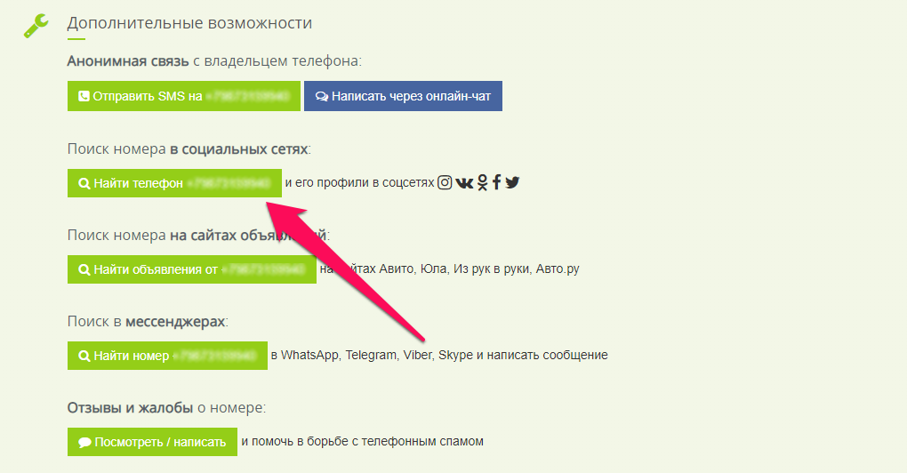 Выполнить поиск номера по соцсетям можно автоматически. За это отвечает специальный сервис MySMSBox. Перейдите на сайт и введите номер в поиске. В основной выдаче сервис покажет к какому оператору в каком регионе принадлежит номер. Опуститесь чуть ниже до дополнительных возможностей.